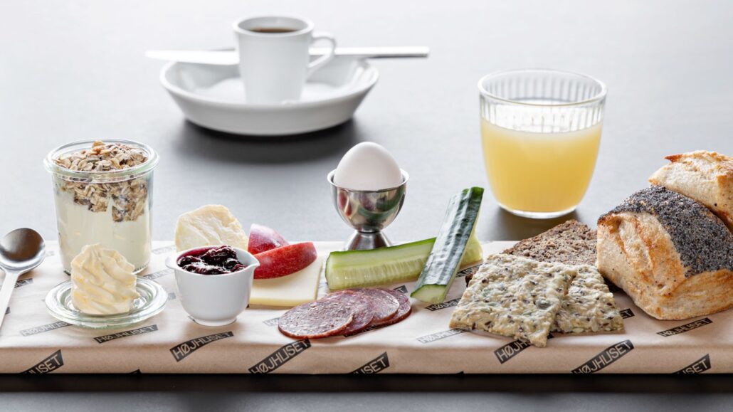 Højhusets morgenmad serveres i Spisesalen og er et enkelt måltid bestående af økologiske råvarer, der varierer efter sæson og kokkens inspiration. Godt brød, æg og ost, marmelade og kødpålæg, gryn og mælk vil typisk være at finde på buffeten. Hertil kaffe, te og juice. Læs mere om husets mad her.
